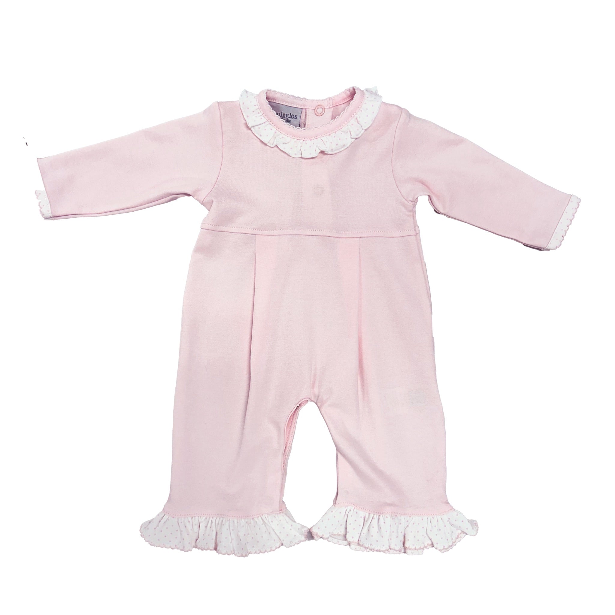 Squiggles Long Sleeve Romper w/ Ruffle Neck, Light Pink/Pink Dot Trim