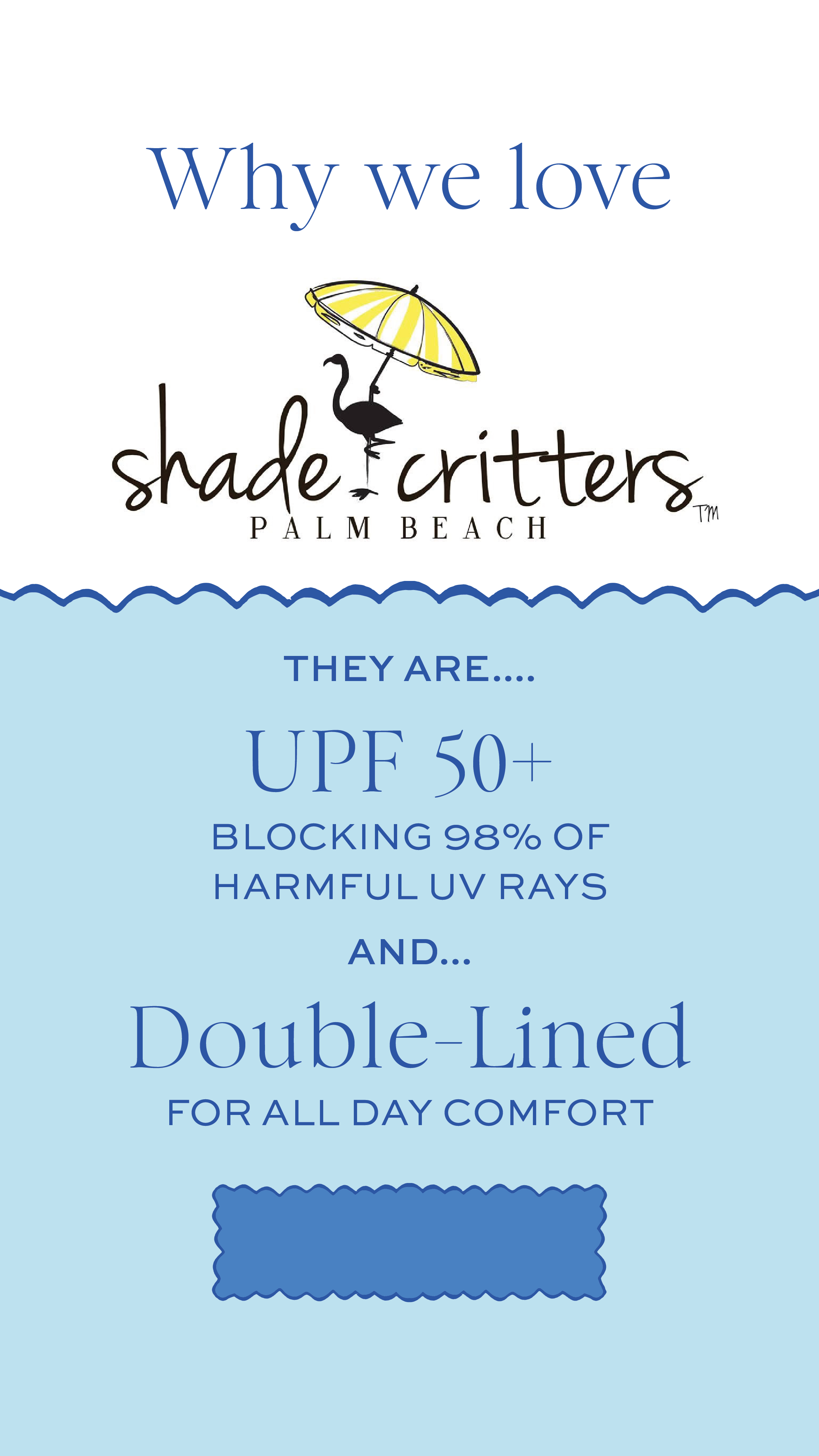 Sun Safety: All Shade Critters swimwear is made with UPF 50+ fabric for excellent sun protection, but we recommend pairing with sunscreen, hats, and shade for full coverage.