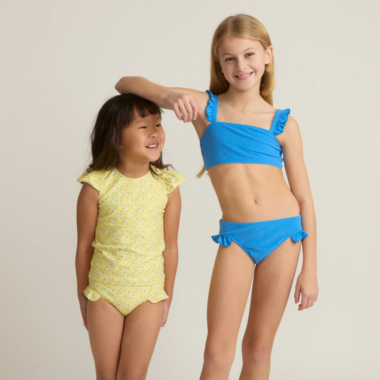 Minnow's new chic square neck two piecehas a ruffle on the straps and at the hips that adds just the right amount of sweetness with an adjustable tie back, to fit (and grow) to your liking!
