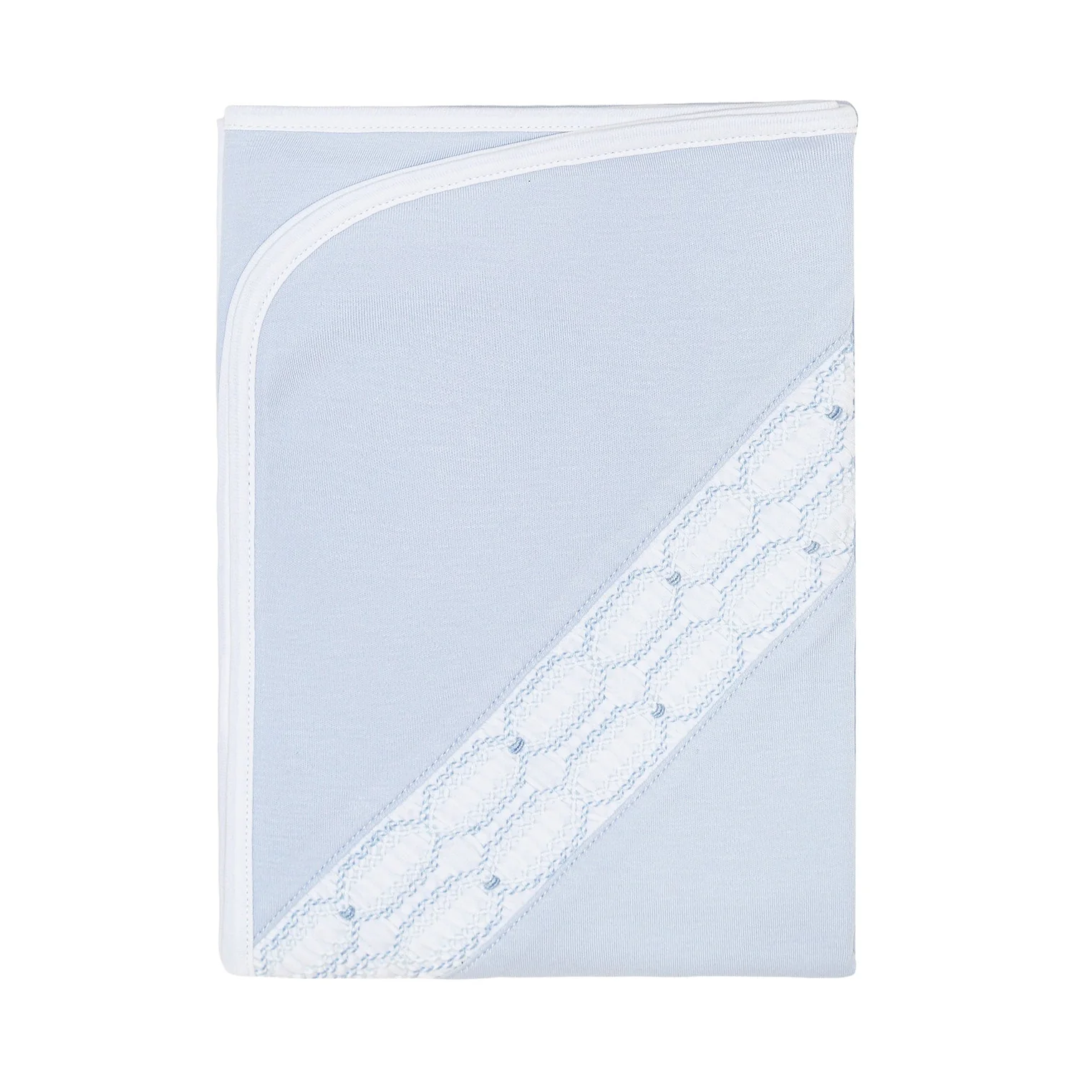 A classic receiving blanket crafted from 100% Pima cotton with 100% hand-smocked detailing. Featuring a double-layer, reversible construction, this blanket is designed to look refined on both sides — when flipped, it retains a polished appearance with no visible backing or unfinished fabric.
