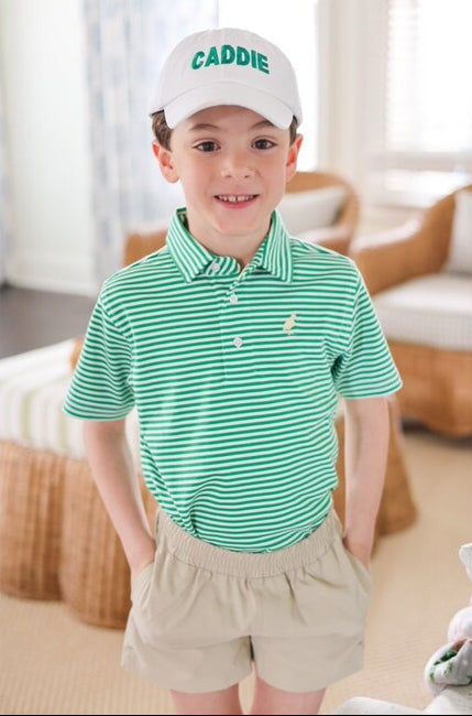 He'll be the cutest little Caddie on the course when he tops off his tee time look with this soft-structured classic cap. In the quintessential golf color pairing of vibrant green upon crisp white, this hat combines preppy coastal charm and sun-protecting, functional sportswear for a brand new silhouette to add more magic to his every golf cart ride and first hole-in-one.