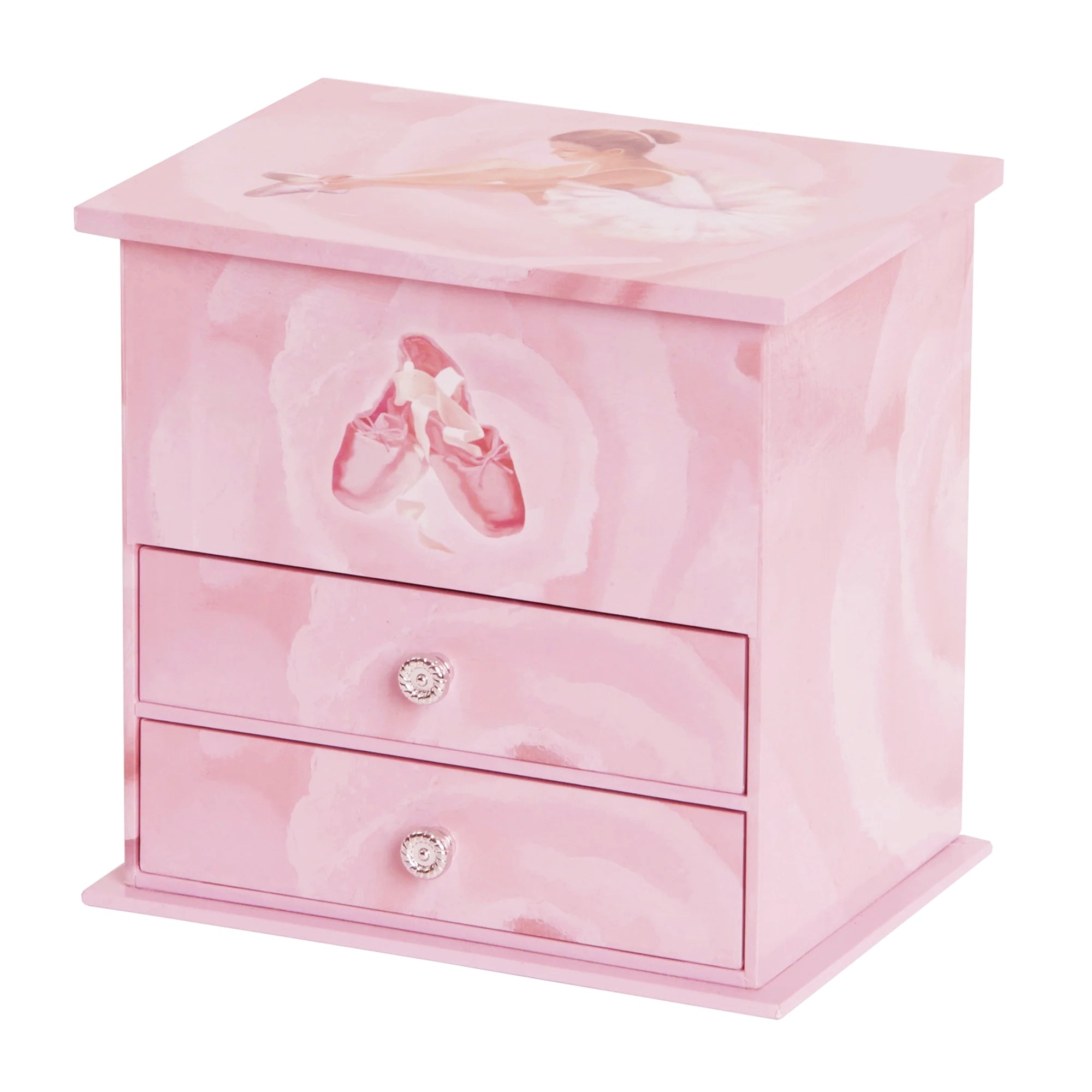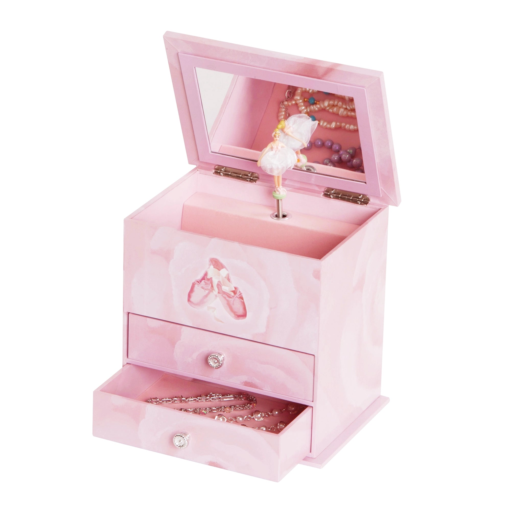 The Mele and Co Casey girl's musical ballerina jewelry box offers timeless appeal and sweet sentiment. With ballerina and ballet slipper design, two drawers, and a twirling ballerina, this jewelry chest will earn accolades from your own tiny dancer.