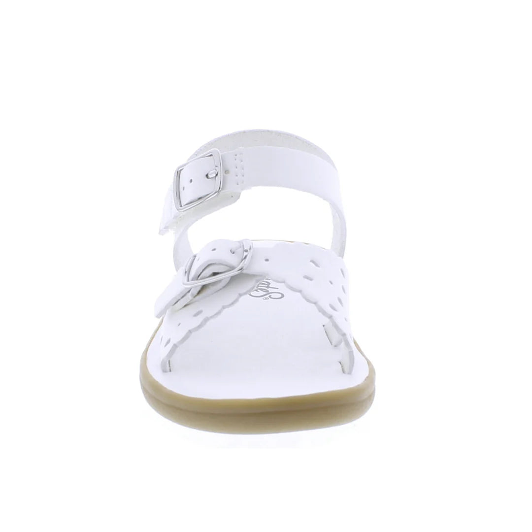 Open-toe, open-heel microfiber sandal featuring true-buckle forefoot strap with decorative tear-drop perf design and hook-and-loop ankle strap with decorative buckle.
