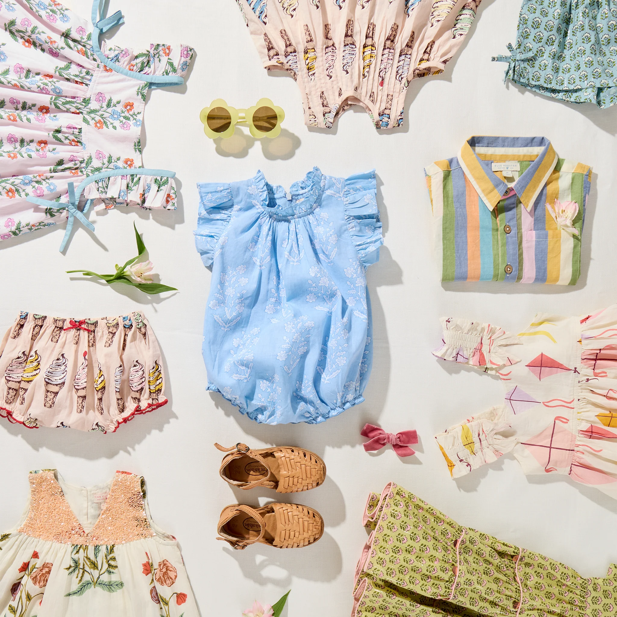 - Ruffle leg openings with blue pearl stitch