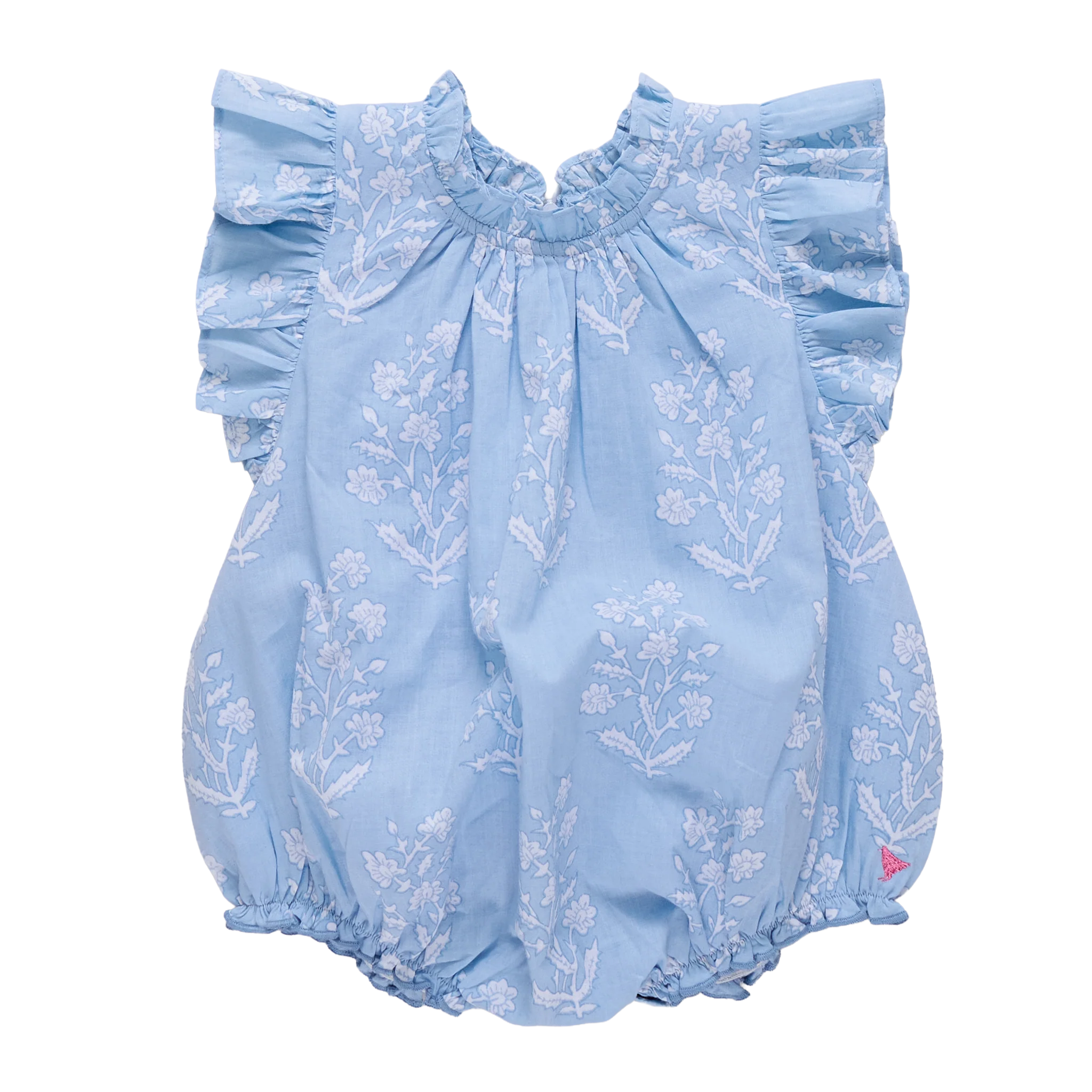 Sweet, airy, and designed for comfort. The Baby Girls Harper Bubble in Blue Dewdrop Blockprint features soft ruffles at the arm openings and neckline for added charm. Ruffle leg openings finished with blue pearl stitching add thoughtful detail, while metal snaps make diaper changes easy. An invisible zipper at the center back keeps the silhouette polished and picture-ready.