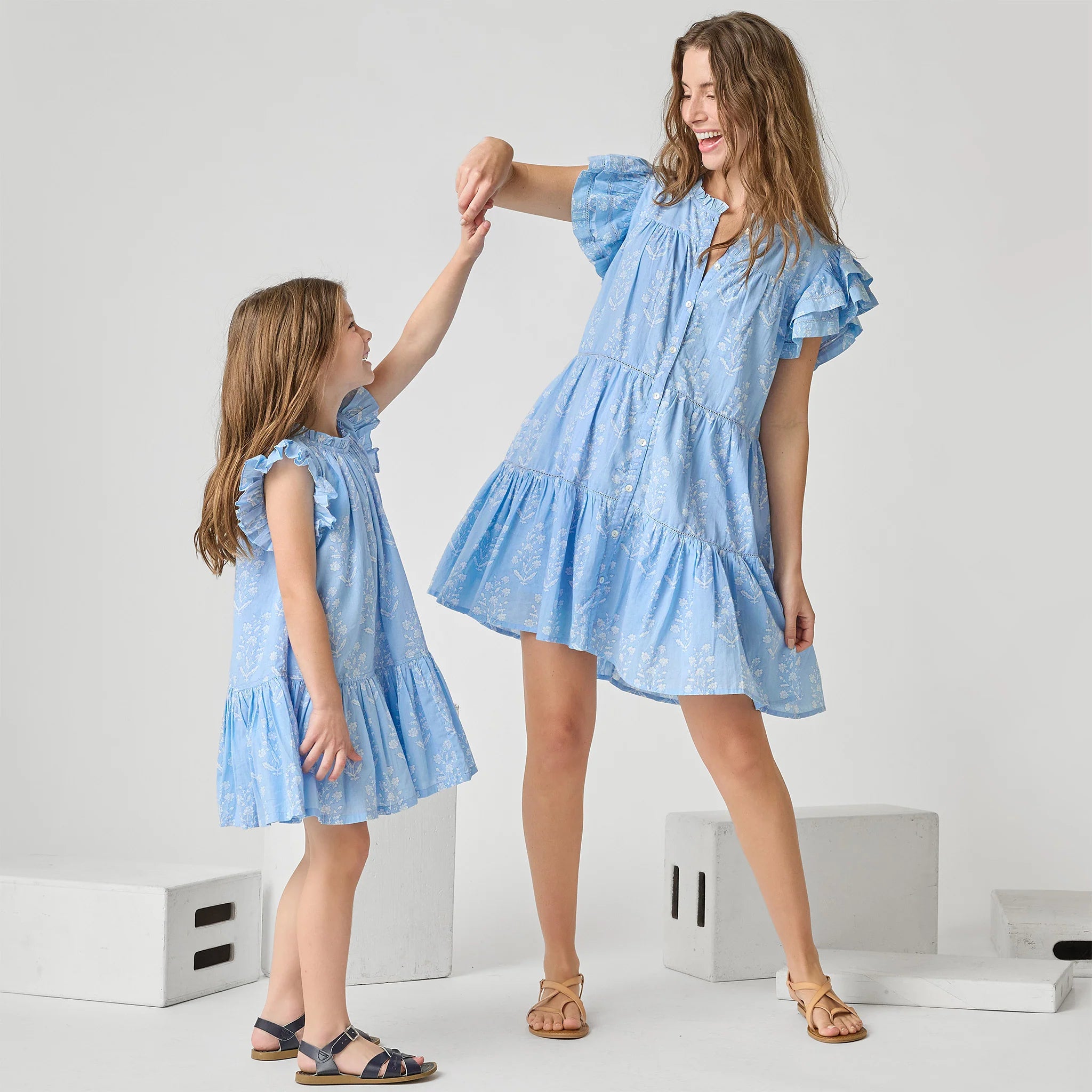 Soft, airy, and endlessly wearable. The Harper Dress in Blue Dewdrop Blockprint features a relaxed silhouette with gentle ruffle detailing that adds just the right amount of sweetness. Crafted in lightweight cotton cambric, it feels breathable and easy for warmer days ahead. Effortlessly polished yet comfortable enough for play, this is the kind of piece she’ll reach for again and again.