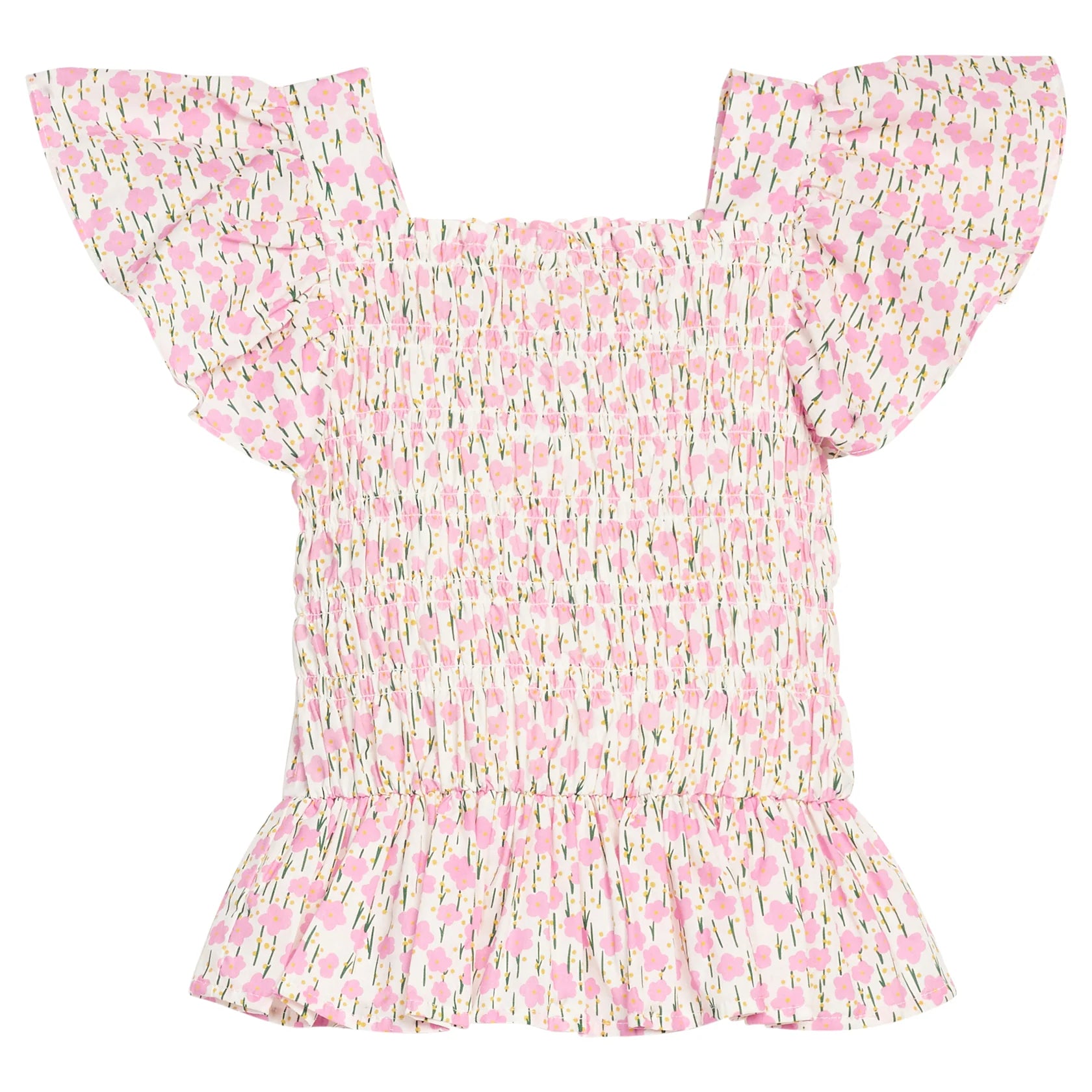 Soft, sweet, and full of flair, this pink floral smocked top is a must-have for any #BISBYgirl's wardrobe! This top features flutter sleeves and a smocked bodice that your trendsetter will wear on repeat. Comfortable and stylish, it’s perfect for pairing with the coordinating tiered skort or our Denim Shorts in Ivory.