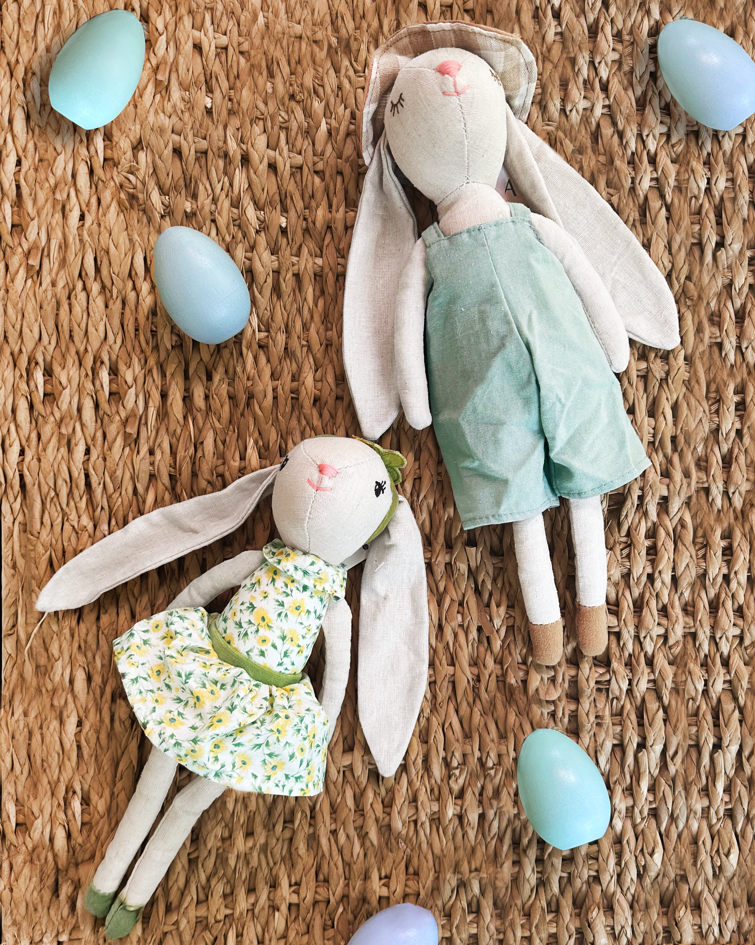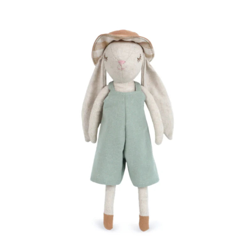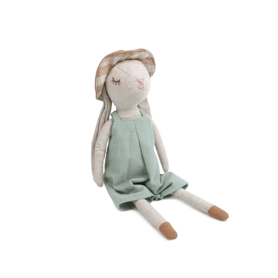 Hop into Easter with Mon Ami's delightful Mr.Hopper Bunny! This charming, one-of-a-kind bunny is here to bring extra joy to the season! Lovingly crafted from soft linen -like material that's gentle on little ones' sensitive skin, Mr. Hopper Bunny sports a whimsical sage colored overall and a gingham sun hat, perfect for sunny spring adventures. With its sweetly embroidered face, long floppy ears, and irresistibly cuddly body, Mr.Hopper Bunny is sure to hop straight into your heart. Make your Easter baskets extra special with this enchanting, snuggle-ready companion!
