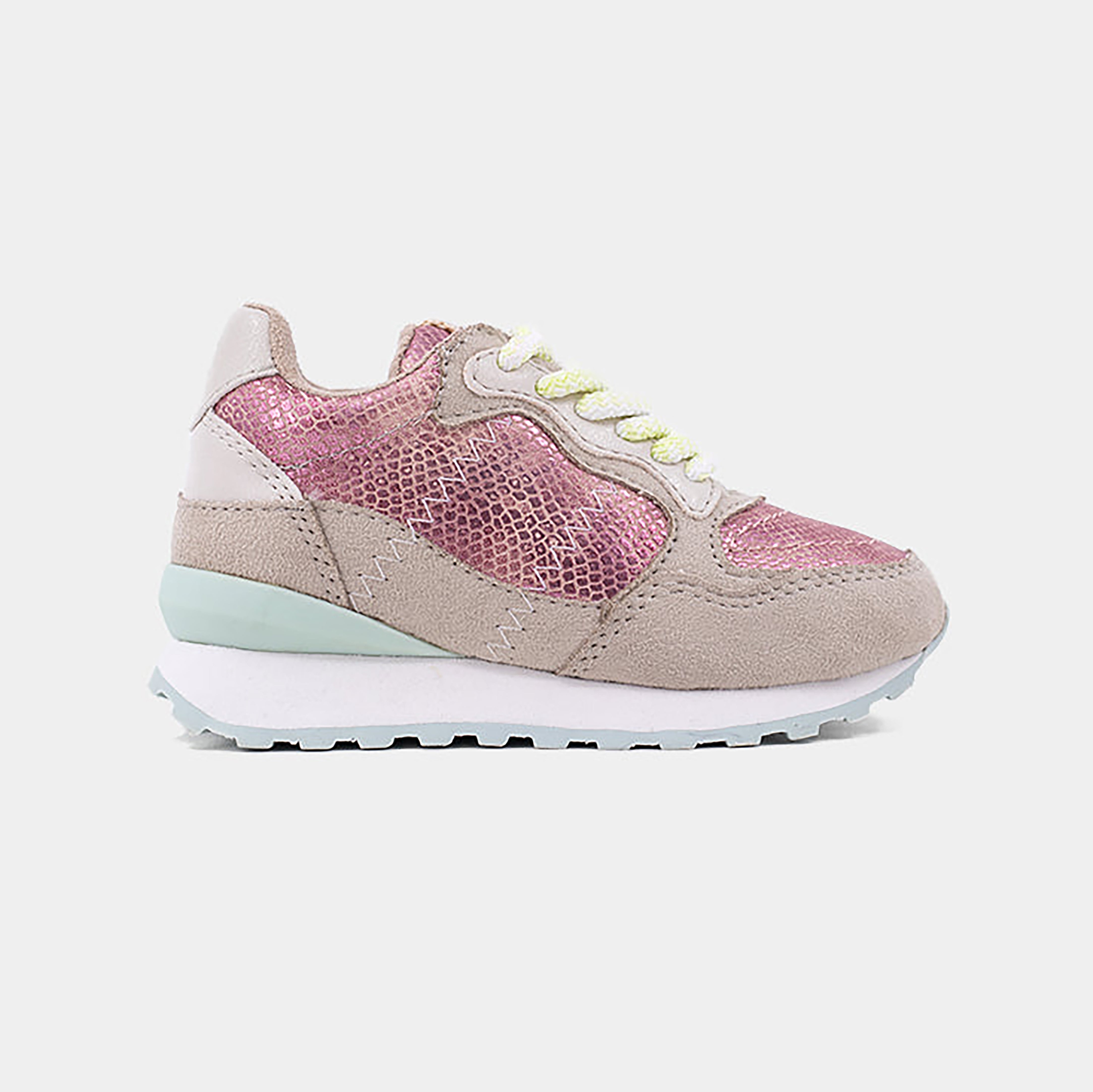 Brighten up your little one's wardrobe with the MINI PHOEBE sneakers in Pink Snake. Featuring a vibrant faux snakeskin texture in playful pink tones, these sneakers bring bold style to kids and toddlers alike. The light blue serrated soles not only add a fun splash of color but also ensure superior grip for active feet. Toddler sizes come with an easy side zipper for quick on-and-off convenience, while the cushioned interior guarantees all-day comfort. Whether for playdates or outings, MINI PHOEBE pairs perfectly with any outfit.