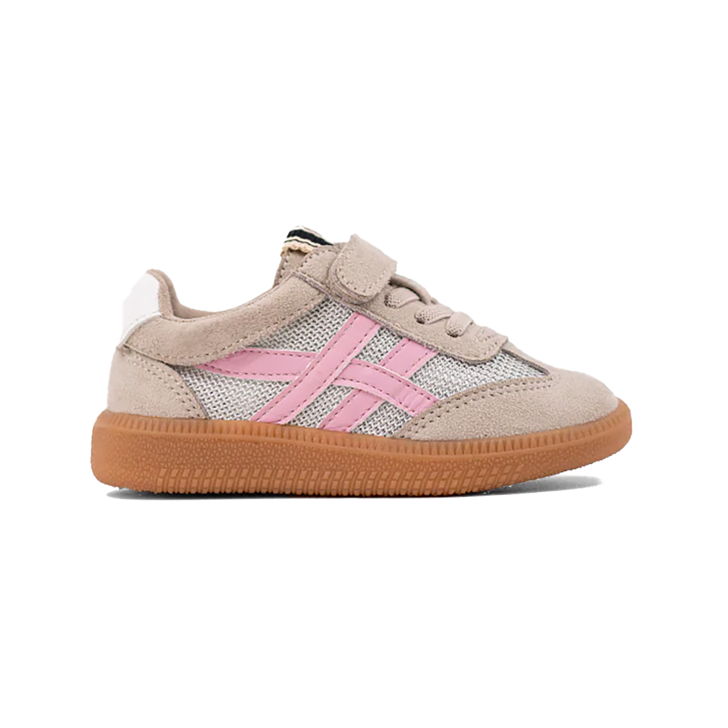 The SASHA MINI in Pink combines style and practicality for kids and toddlers. Featuring soft beige suede and breathable mesh, it's highlighted by vibrant pink faux-leather stripes that add a playful pop of color. The durable gum rubber sole ensures comfort and grip for active days, while toddler sizes include velcro closures for easy wear. Finished with light gray laces and the signature "S" metallic tag, this sneaker is also part of our "Mommy & Me" collection; perfect for stepping out in coordinated style with mom!