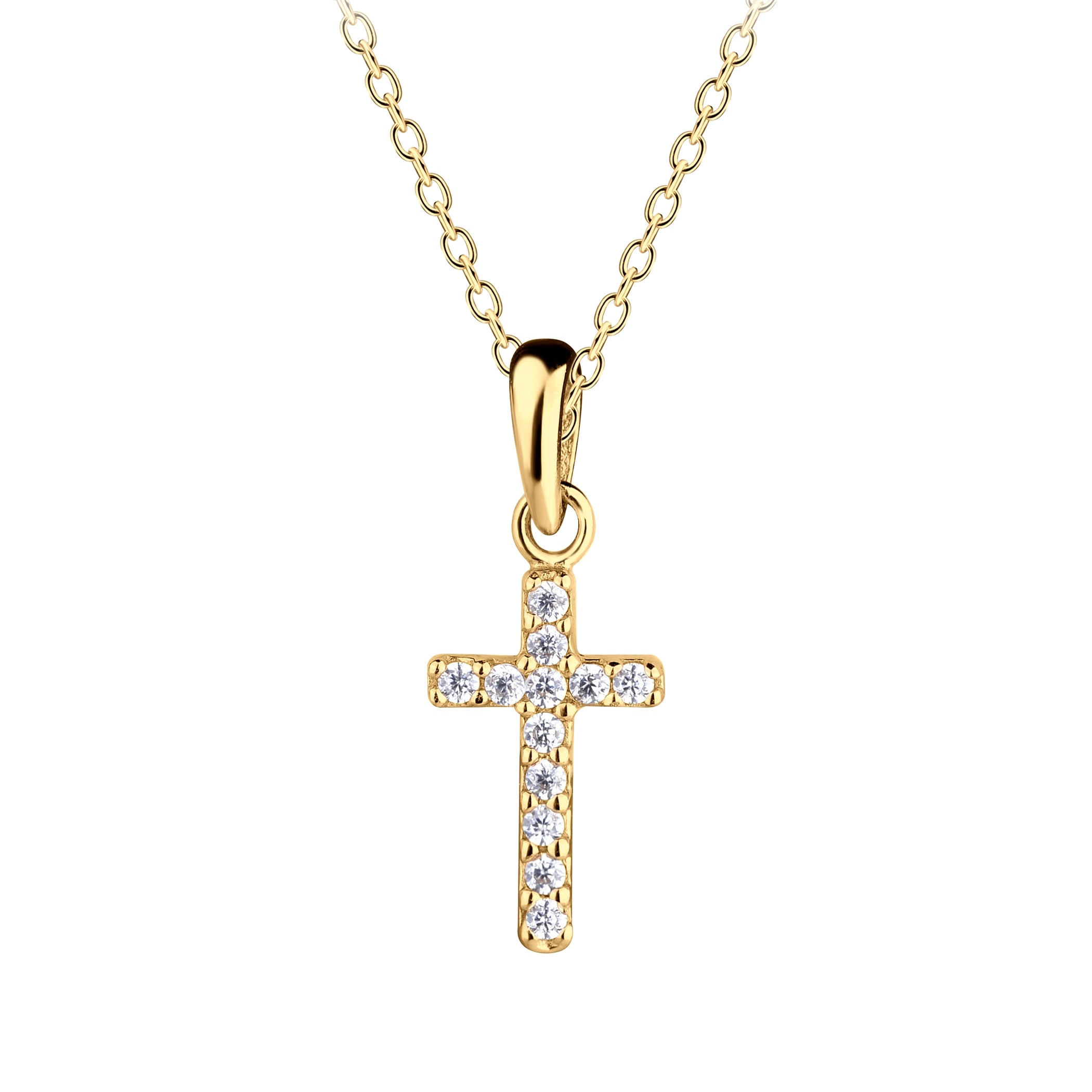 Stunning 14K Gold-plated cross necklace accented with sparkling CZs. This high quality necklace is sterling silver with 14K gold plating floating on a 14 inch or 16-18 inch adjustable Italian chain. Perfect gift for those special occasions such as first communion, confirmation, or baptism gift for girls! This is a special keepsake gift for toddlers, kids, and little girls and comes in a beautiful gift box that kids love.