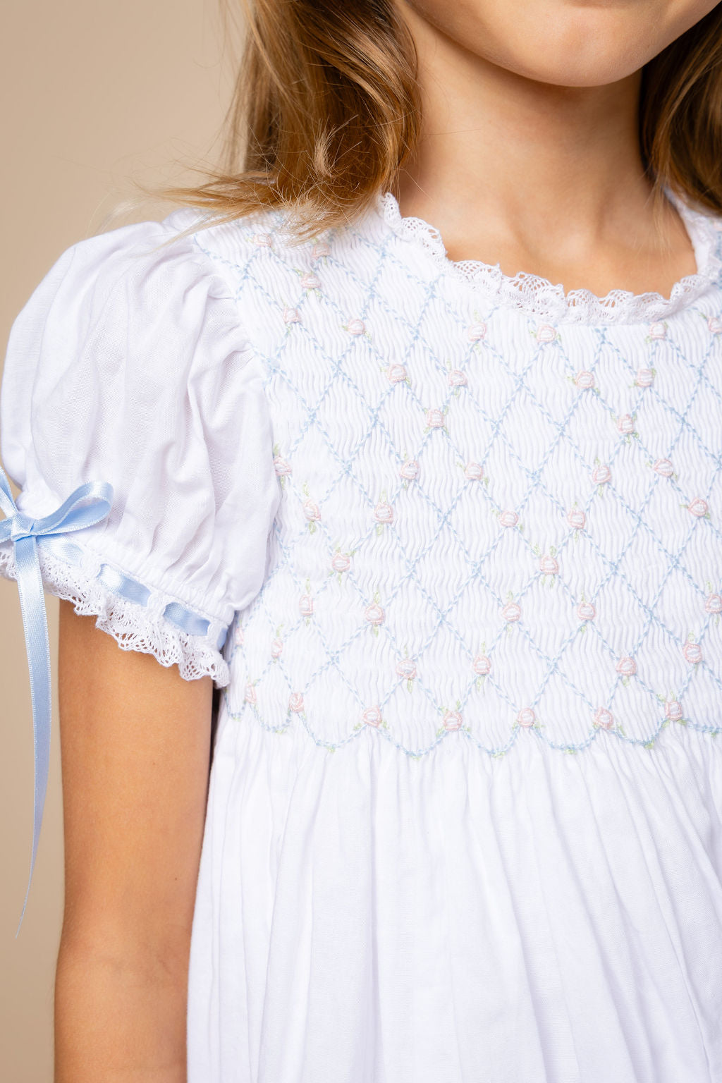 Percy & Tyne Heirloom Smocked Dress, White Batiste w/ Pink and Blue