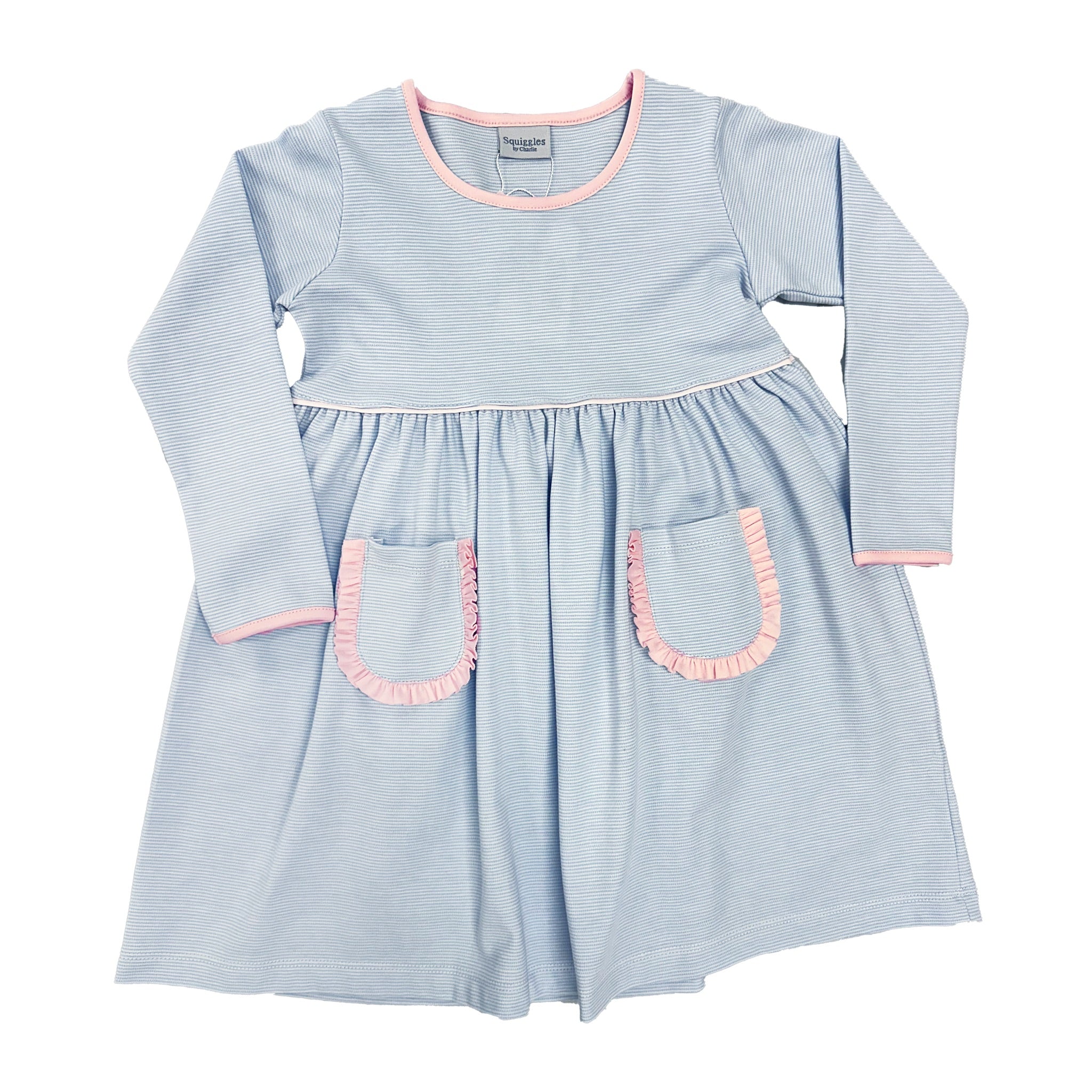 Squiggles Long Sleeve Popover Dress, Blue Stripe/Pink Trim