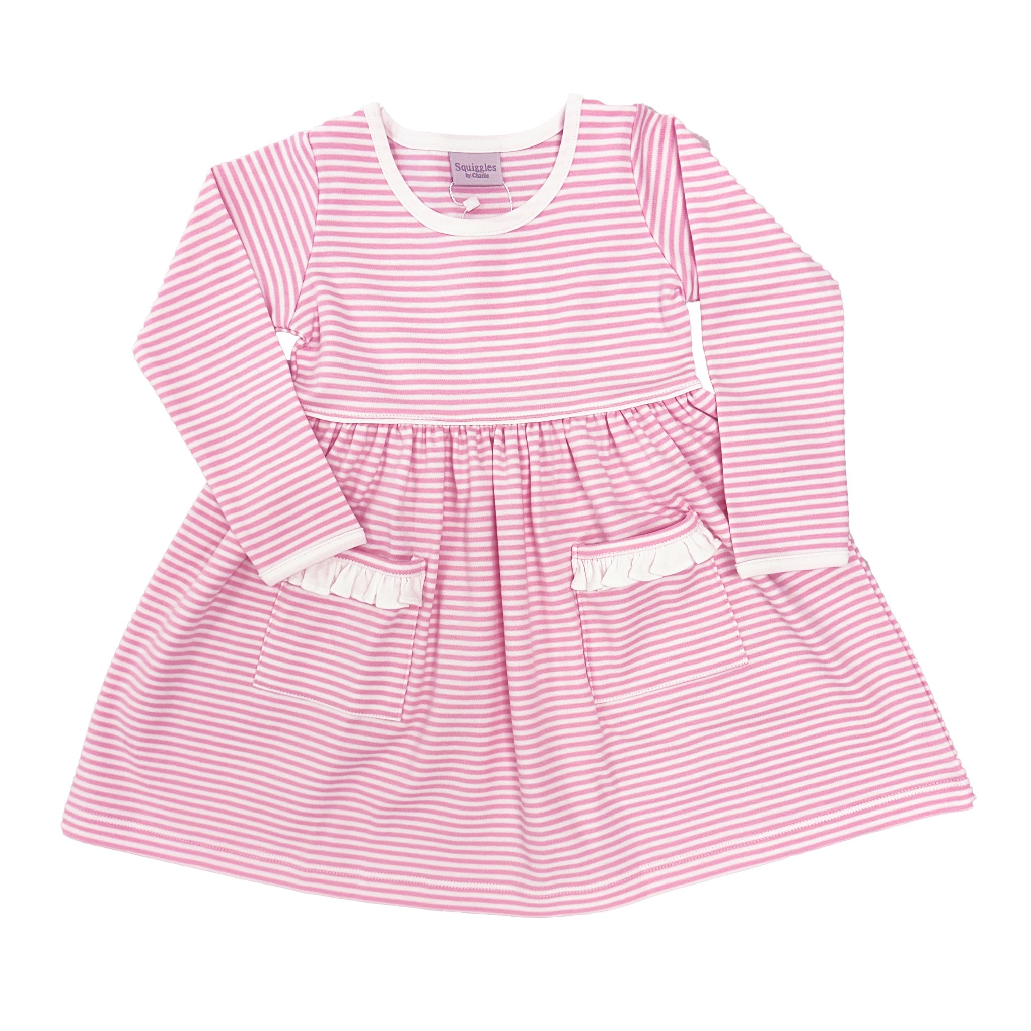 Squiggles Long Sleeve Popover Dress, Pink Stripe/White Trim